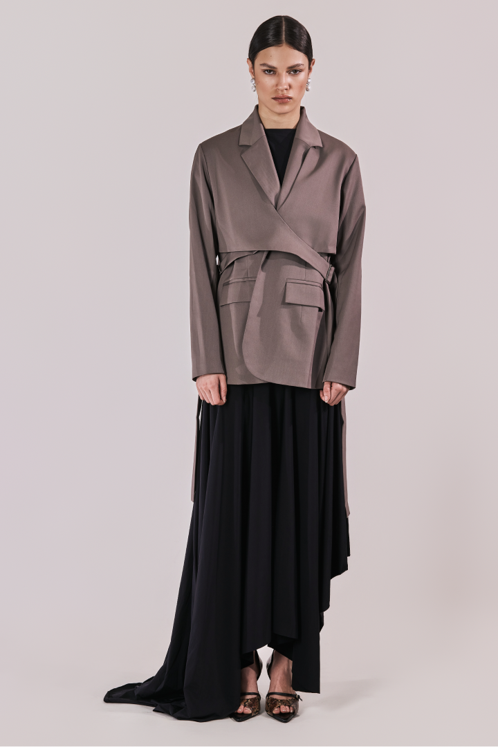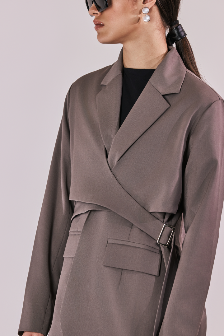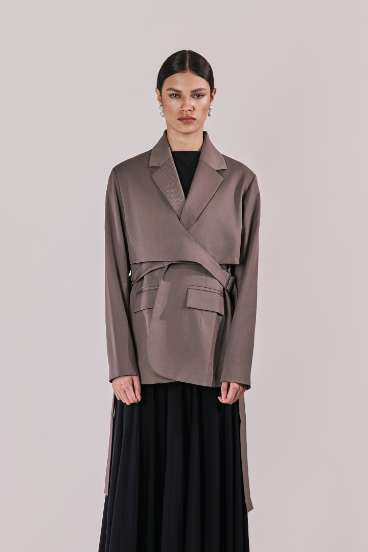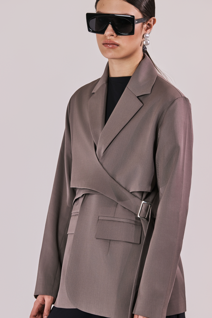 Blazer en paño taupe estructurado, con pechera cruzada y graduadores laterales para ajustar la silueta. Diseño de líneas fuertes y espíritu utilitario que permite múltiples formas de uso según el styling.