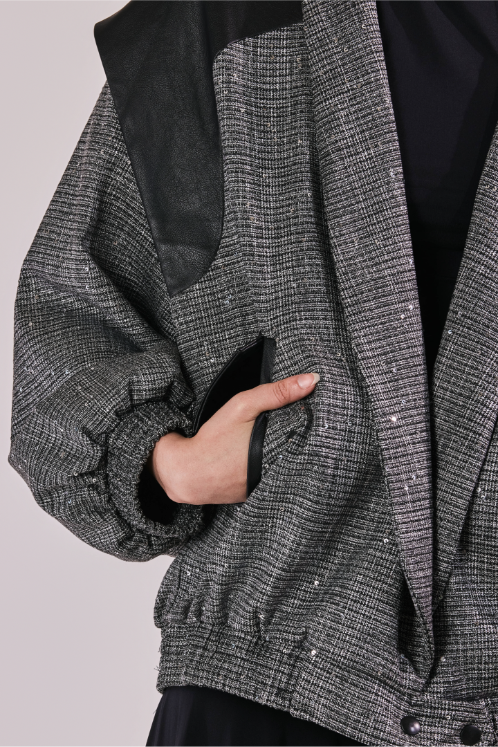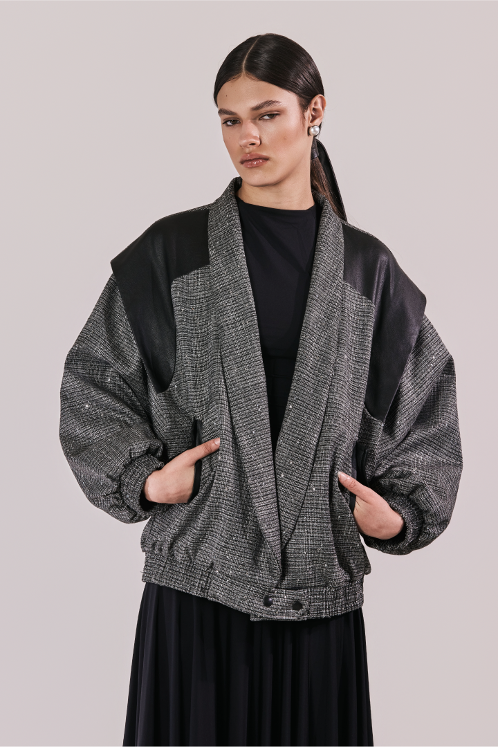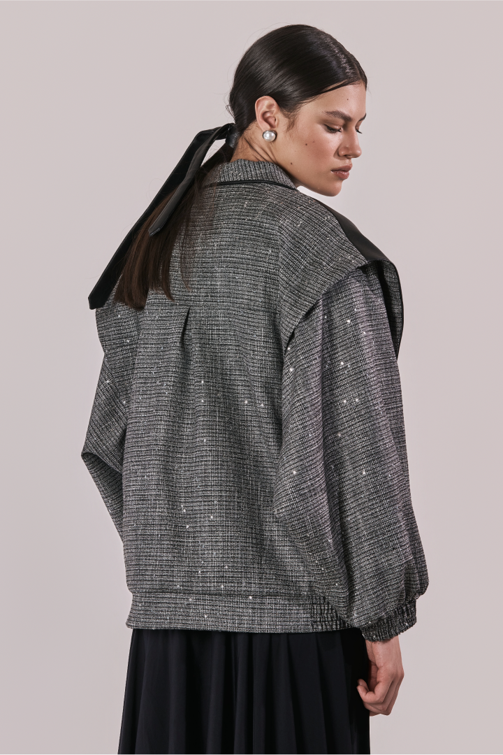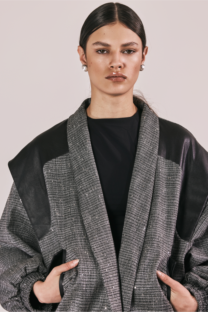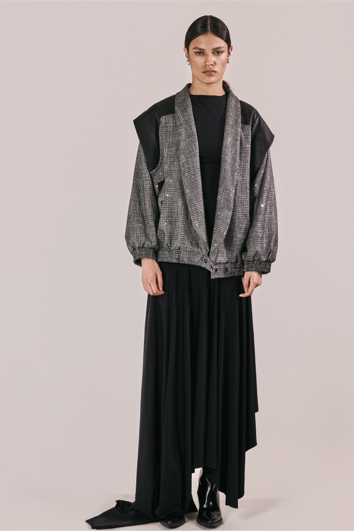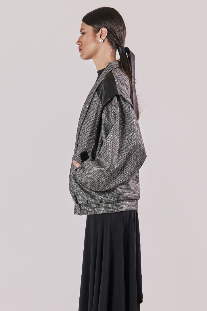 Chaqueta oversize en paño gris con lentejuelas, con hombreras en cuerina, solapa tipo smoking y manga bombacha. Un contraste entre brillo y estructura que eleva la pieza a un lenguaje de power dressing contemporáneo.
