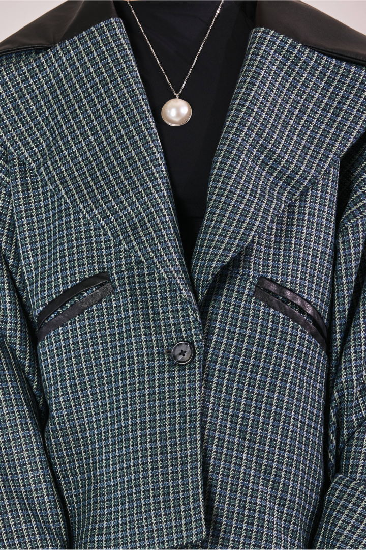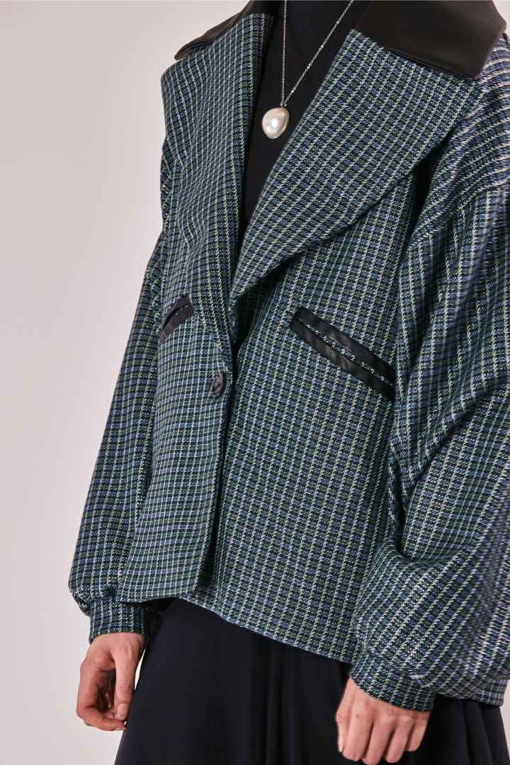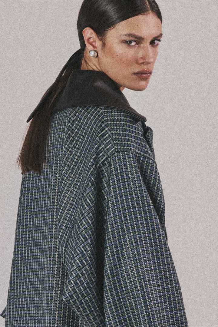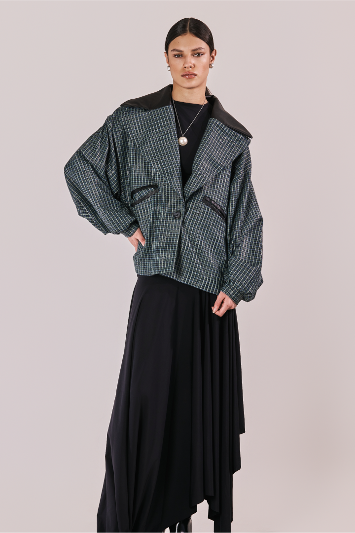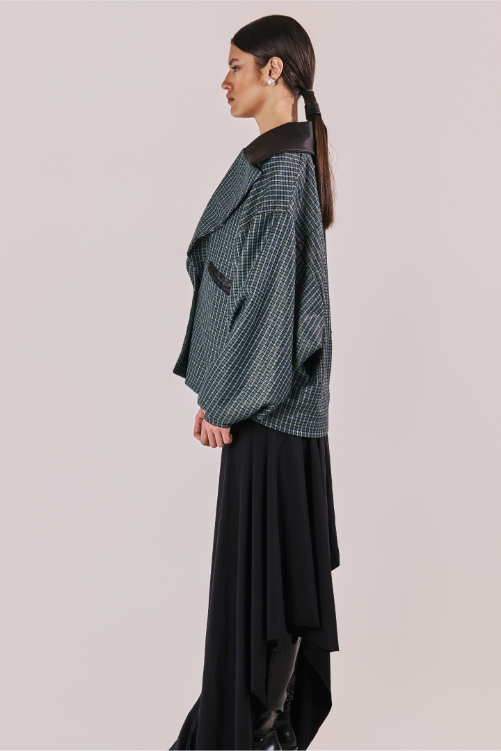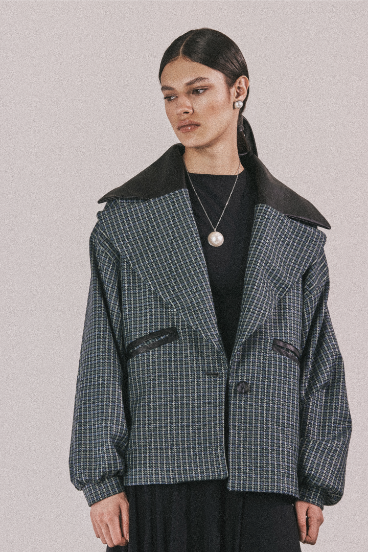 Chaqueta en paño italiano de cuadros, con solapa oversize de inspiración biker, manga tipo murciélago y cuello en cuerina negra. Una pieza statement que fusiona estructura y volumen con una lectura contemporánea del clásico sartorial.