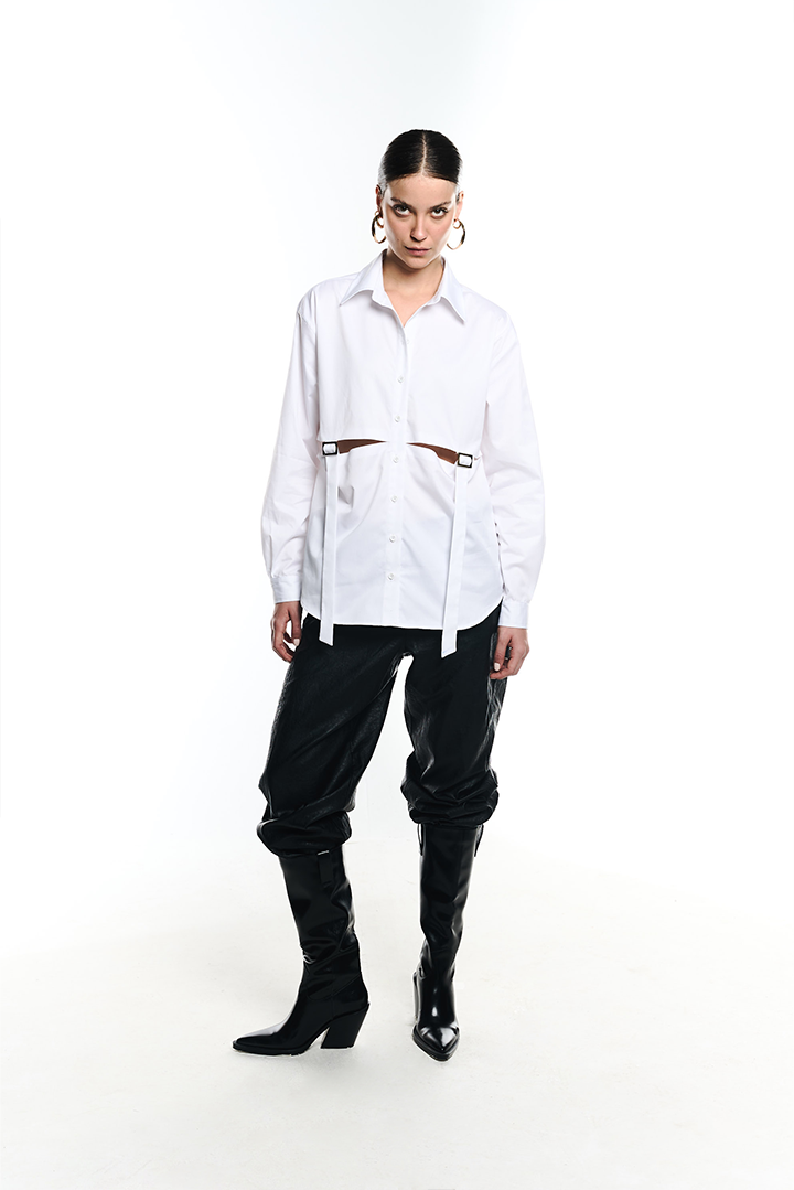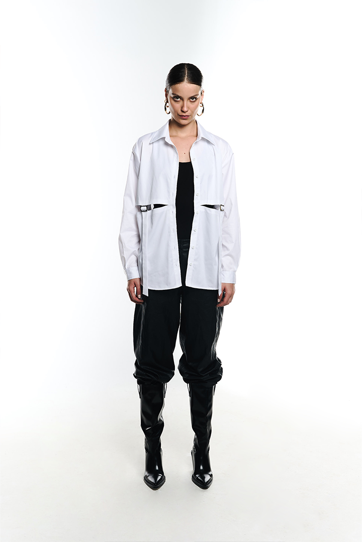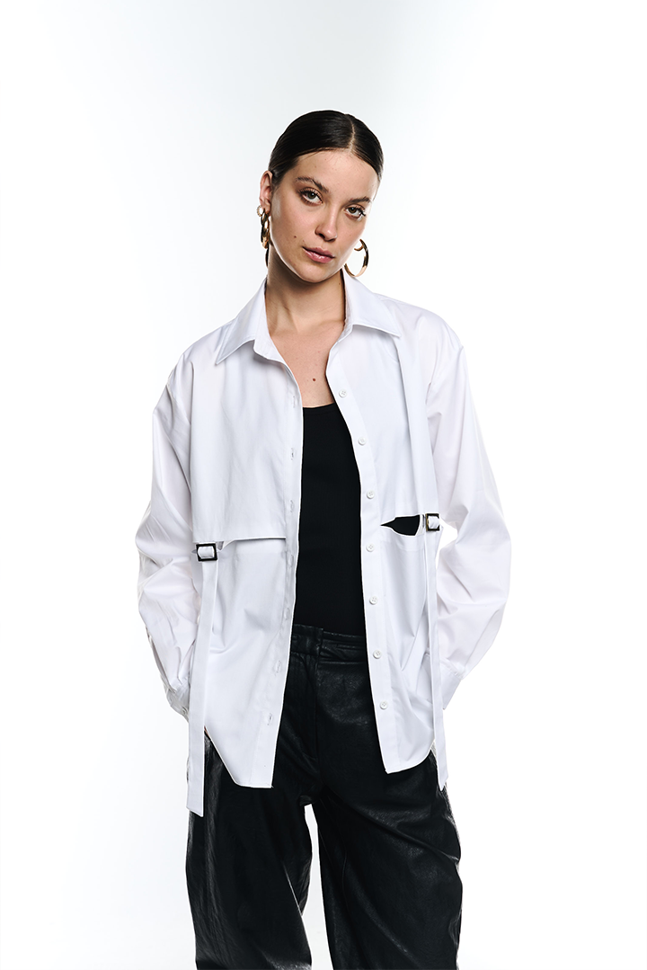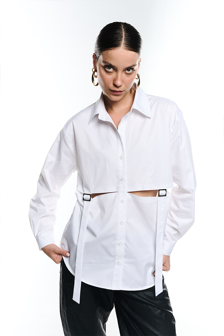 Camisa oversize con corte a la cintura y tiras graduables que permiten jugar con el volumen y el estilo. Disponible en blanco o azul claro, esta blusa combina estructura y libertad en una silueta versátil, cool y diferente. Ideal para elevar looks casuales o llevar con pantalones más formales